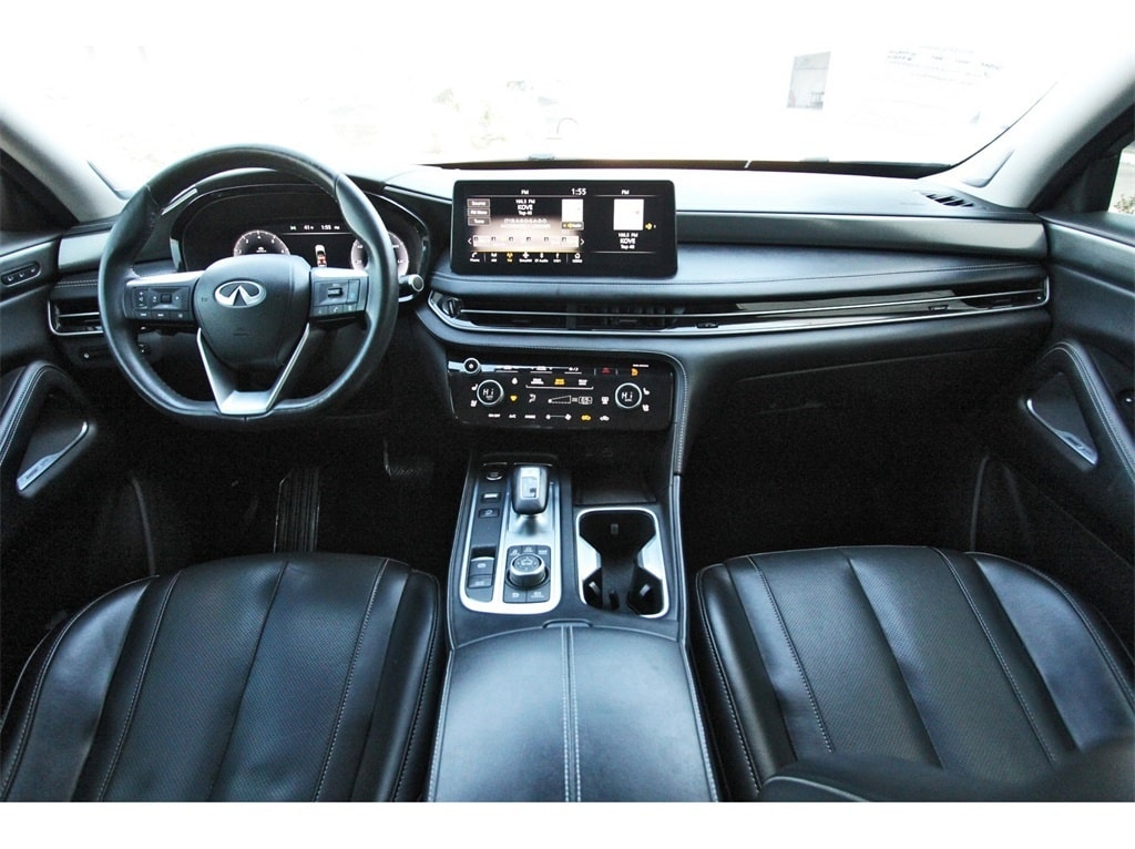 South Houston Nissan is proud to present you with another True Market Priced Pre-Owned Vehicle. This 2023 INFINITI QX60 LUXE is loaded with the following Factory Options: Cargo Package (Cargo Mat (Reversible) and First Aid Kit), Performance Audio Package (Bose Performance Series 17-Speaker Sound System), 3rd row seats: bench, 4-Wheel Disc Brakes, 4.334 Axle Ratio, 9 Speakers, ABS brakes, Air Conditioning, Alloy wheels, AM/FM radio: SiriusXM, Anti-whiplash front head restraints, Auto High-beam Headlights, Auto-dimming door mirrors, Auto-dimming Rear-View mirror, Automatic temperature control, Brake assist, Bumpers: body-color, Climate-Controlled Front Bucket Seats, Delay-off headlights, Driver door bin, Driver vanity mirror, Dual front impact airbags, Dual front side impact airbags, Electronic Stability Control, Emergency communication system, Floor Mats on Bench Seats w/3rd Row Tray, Four wheel independent suspension, Front anti-roll bar, Front Bucket Seats, Front Center Armrest, Front dual zone A/C, Front reading lights, Fully automatic headlights, Garage door transmitter: HomeLink, Heated door mirrors, Heated front seats, Heated steering wheel, Illuminated entry, Knee airbag, Leather Shift Knob, Leather steering wheel, Leather-Appointed Seating Surfaces, Literature Kit, Low tire pressure warning, Memory seat, Navigation system: INFINITI InTouch Navigation, Occupant sensing airbag, Outside temperature display, Overhead airbag, Overhead console, Panic alarm, Passenger door bin, Passenger vanity mirror, Power door mirrors, Power driver seat, Power Liftgate, Power moonroof, Power passenger seat, Power steering, Power windows, Radio data system, Radio: AM/FM Audio System, Rain sensing wipers, Rear air conditioning, Rear anti-roll bar, Rear reading lights, Rear seat center armrest, Rear side impact airbag, Rear window defroster, Rear window wiper, Reclining 3rd row seat, Remote keyless entry, Security system, Speed control, Speed-sensing steering, Speed-Sensitive Wipers, Splash Guards, Split folding rear seat, Spoiler, Steering wheel memory, Steering wheel mounted audio controls, Tachometer, Telescoping steering wheel, Tilt steering wheel, Traction control, Trip computer, Turn signal indicator mirrors, Variably intermittent wipers, Ventilated front seats, and Wheels: 20" x 8J Sporty Machined Aluminum Alloy!!