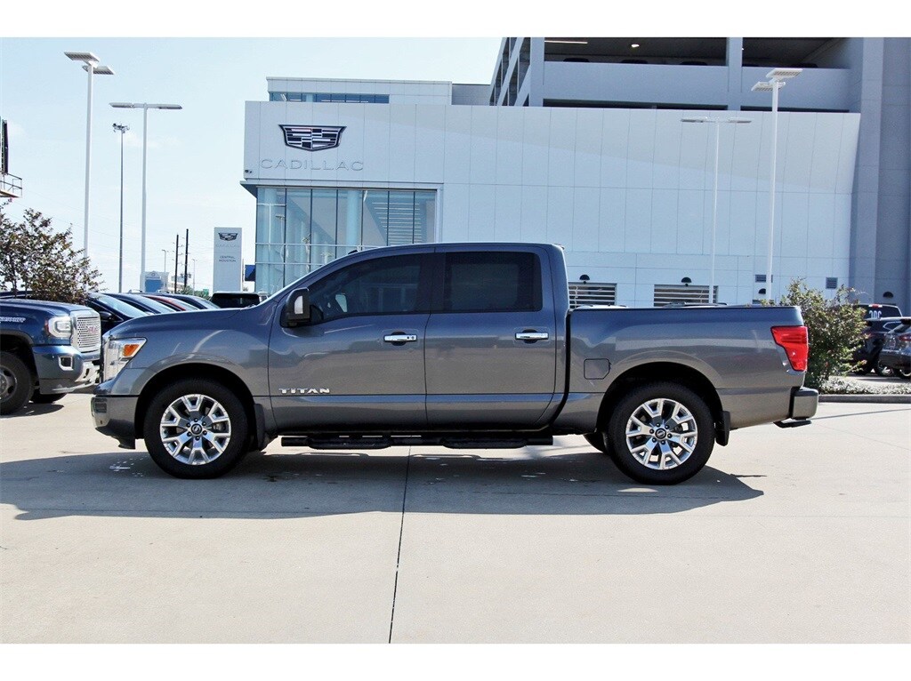 Central Houston Nissan is proud to present you with another True Market Priced Pre-Owned Vehicle. This 2021 Nissan Titan SV is loaded with the following Factory Options: SV Chrome (20" Wheels, Chrome Exhaust Finisher, Chrome Front Grille (Inner & Outer), Metallic Kick Plates, and Wheels: 20" x 8" Chrome), SV Convenience Package (110V/12V Outlets In Back Of Center Console, 2 Illuminated USB-A Ports In Back Of Center Console, Auto-Dimming Rear-View Mirror, Chrome Interior Door Locks, Convex Spotter Mirror, Dedicated Cell Phone Holder, Dual Zone Automatic HVAC, Front & Rear Parking Sensors, Heated Front Captain's Chairs, Intelligent Key System, Leather-Wrapped Steering Wheel, Power Sliding Rear Window w/Defogger, Radio: NissanConnect w/Navigation, Rear HVAC Vents, Remote Engine Start on Key Fob, and Traffic Sign Recognition (TSR)), SV Tow Package (4-Pin/7-Pin Wiring Harness Connector (Rear Bumper), Black Front Tow Hooks, Heated Manually Extendable Tow Mirrors, Puddle Lamps, Receiver Hitch, Trailer Brake Controller, and Trailer Light Check Function On Key Fob), SV Utility Package (110V Outlet in Bed, Auto-Dimming Rearview Mirror w/UGDO, Electronic Locking Tailgate, Flat Floor Function w/Tie Down Hooks, LED Tailgate Area Illumination, LED Under Rail Bed Lighting, Rain Sensing Wipers, Rear Utility Bed Step, Spray-On Bedliner, Universal Garage Door Opener, and Utilitrack System w/4 Tie-Down Cleats), 3.692 Axle Ratio, 4-Wheel Disc Brakes, 6 Speakers, ABS brakes, Air Conditioning, Alloy wheels, AM/FM radio: SiriusXM, Auto High-beam Headlights, Bed Assist Grip, Blind Spot Warning, Brake assist, Bumpers: chrome, Carpet Floor Mats (L95), Cloth Seat Trim, Driver door bin, Driver vanity mirror, Dual front impact airbags, Dual front side impact airbags, Electronic Stability Control, Emergency communication system: NissanConnect Services, Front anti-roll bar, Front Center Armrest w/Storage, Front reading lights, Front Split Bench Seat (40/20/40), Front wheel independent suspension, Fully automatic headlights, Heated door mirrors, Illuminated entry, Knee airbag, Loop Side Steps, Low tire pressure warning, NissanConnect featuring Apple CarPlay and Android Auto, Occupant sensing airbag, Outside temperature display, Overhead airbag, Overhead console, Panic alarm, Passenger door bin, Passenger vanity mirror, Power door mirrors, Power steering, Power windows, Radio data system, Radio: NissanConnect AM/FM, Rear anti-roll bar, Rear Bumper Step w/Electronic Tailgate Lock, Rear Parking Sensors, Rear seat center armrest, Rear step bumper, Rear window defroster, Remote keyless entry, Security system, Speed control, Speed-sensing steering, Speed-Sensitive Wipers, Splash Guards, Split folding rear seat, Steering wheel mounted audio controls, Tachometer, Telescoping steering wheel, Tilt steering wheel, Traction control, Trip computer, Variably intermittent wipers, Voltmeter, and Wheels: 18" x 8" Silver Painted Alloy!!